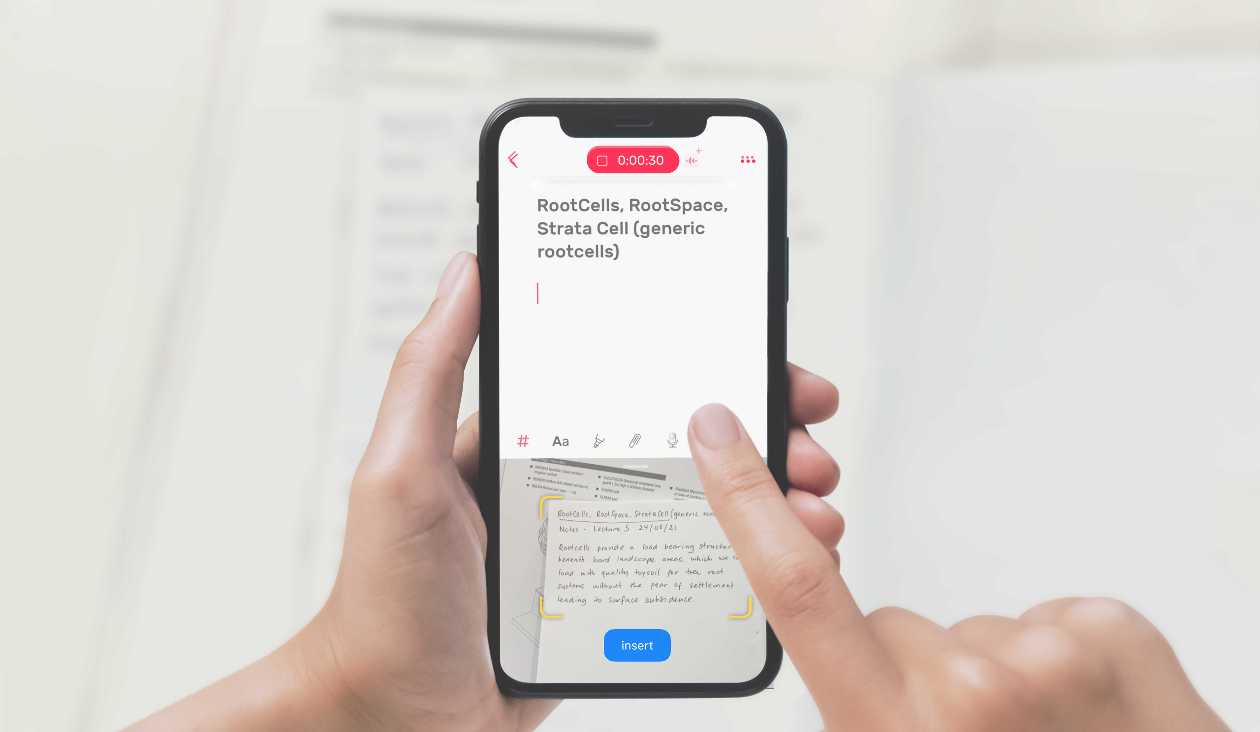 Handwritten or printed documents can be easily converted into editable notes using Noted. Simply tap the 📎 Attachment button on your editor toolbar to launch the menu. Then select the scan text option and snap a picture of the handwritten notes. (The image should be clear and the text legible.)