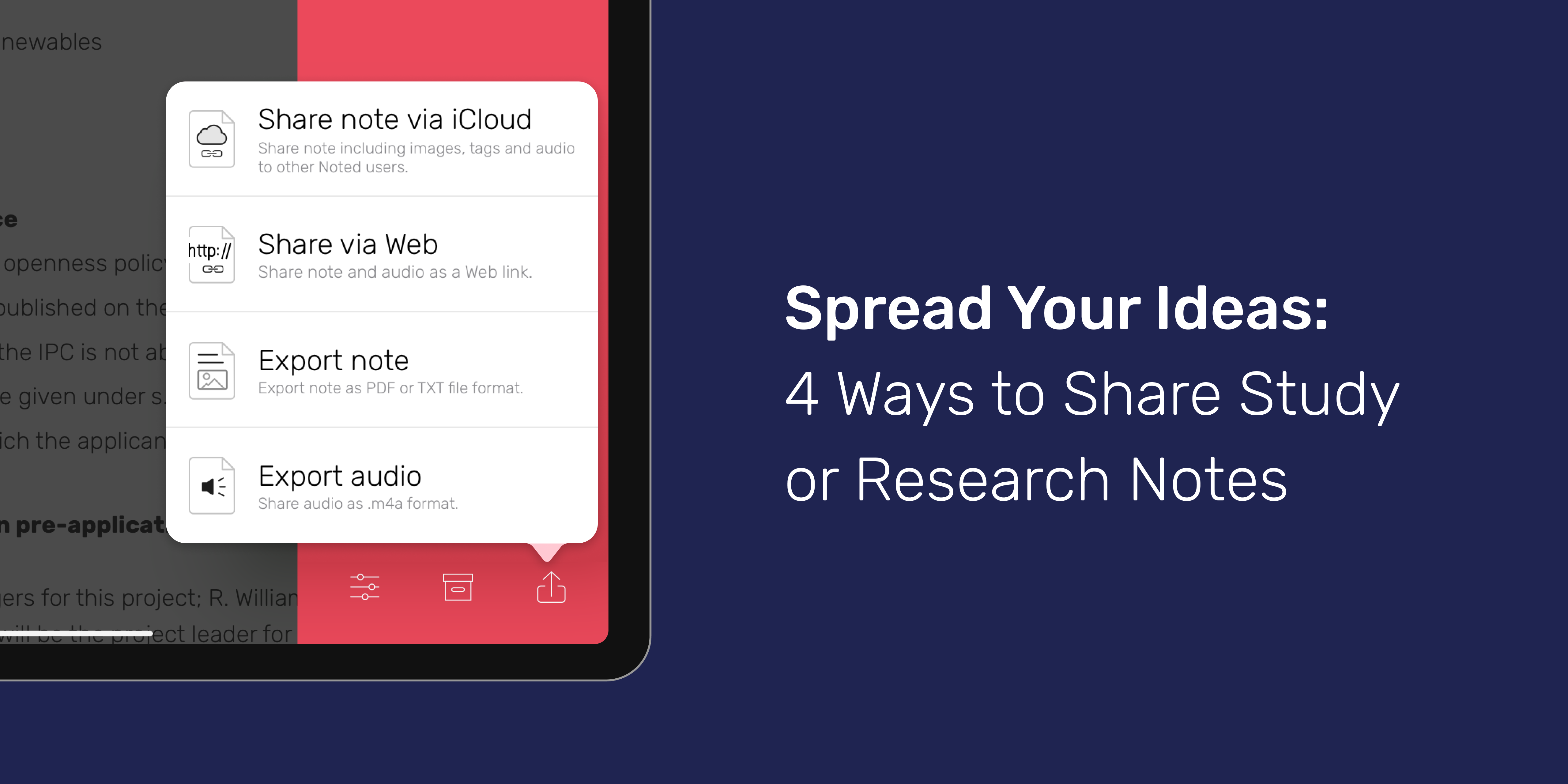 Noted provides a number of ways to share your notes straight from your device. This is ideal when you’re working independently on a group project and you want to share, discuss, and explore ideas with fellow students; or you simply want to share some brainstorming ideas with a teammate at work.